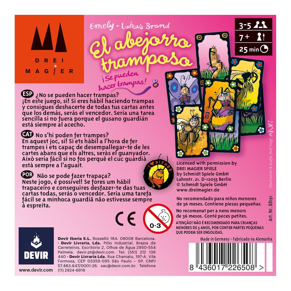 Si estás listo para un juego que te va a retar con acciones locas y trampas sigilosas, tienes que probar El abejorro tramposo. Este juego es ligeramente más complejo de La polilla tramposa, e incluye cartas de acción aún más alocadas. Es ideal para jugar con la familia, sobre todo con niños mayores. Para una partida rápida con muchísimas risitas aprende a jugar en Devir TV.