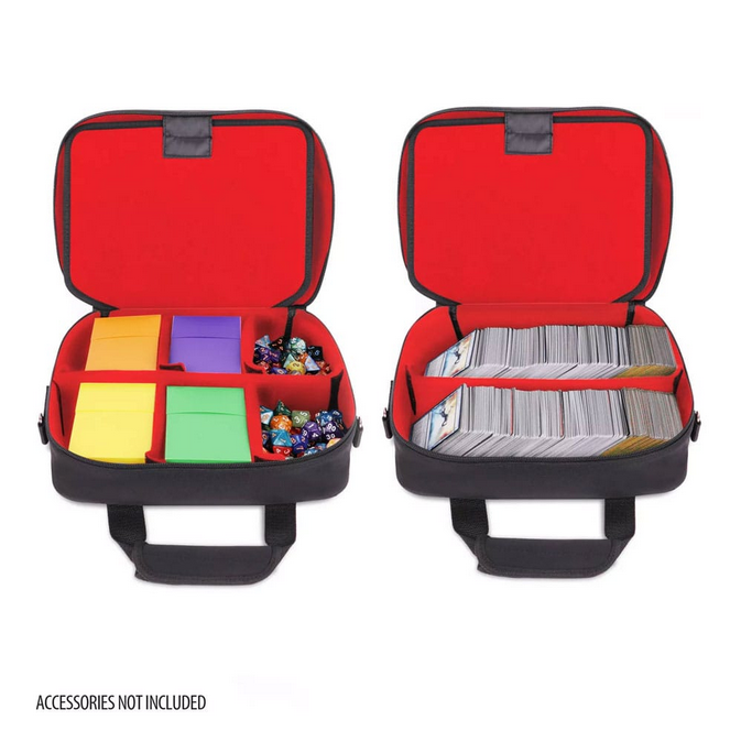Estuche con compartimentos personalizables para cartas, tapete de juego, dados, cuadernos y otros accesorios.